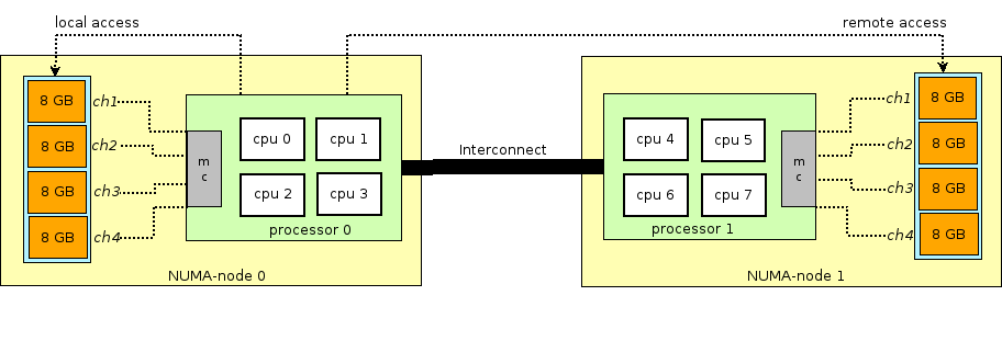 ** 아래 그림을 설명하면, NUMA-node1 cpu4에서 실행중인 파이버를 NUMA-node0 cpu1로 이동하면 remote access가
