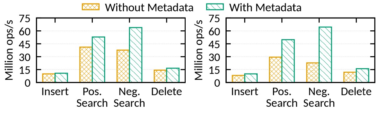 삽입(왼쪽) 및 검색(오른쪽) 작업 시 2개의 최첨단 PM 해시 테이블의 처리량을 보여줍니다(자세한 내용은 섹션 6 참조).