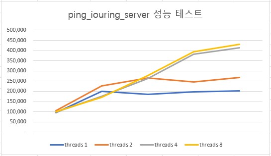 ping_iouring_server를 스레드 1개, 2개, 4개, 8개로 테스트했습니다.