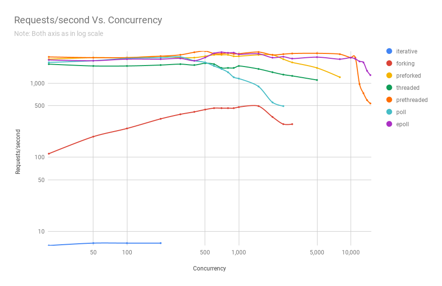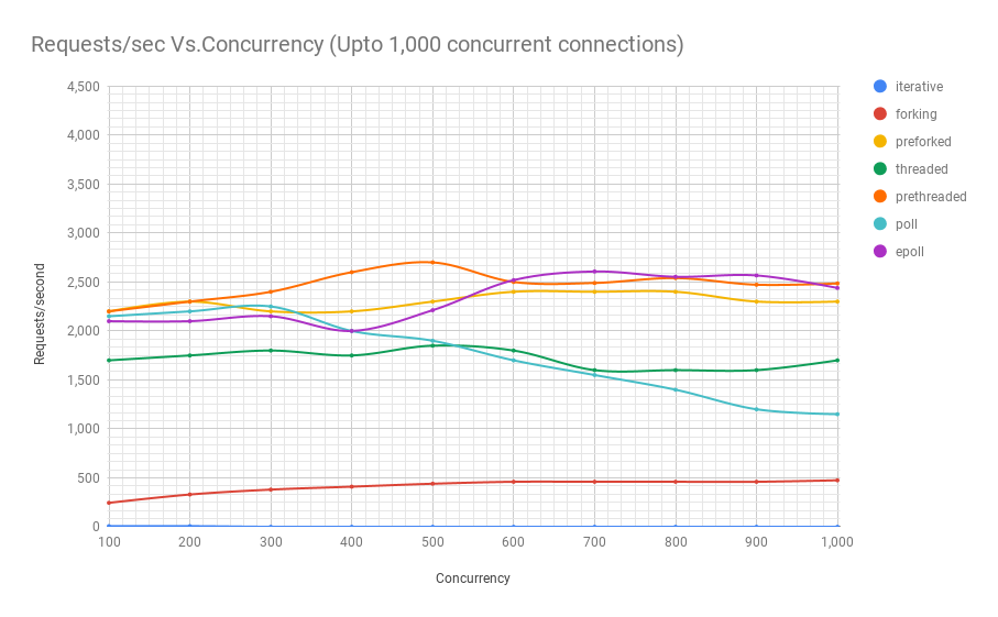 다음은 기능적으로 동일하지만 다른 Linux 프로세스 모델을 사용하여 작성된 교육용 웹 서버를 사용하여 실험을 실행한 차트입니다.